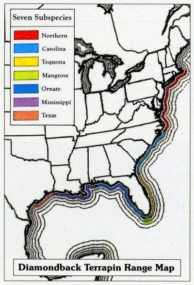 There are currently seven described subspecies of Malaclemys terrapin, the Diamondback Terrapin (there is an argument for only five subspecies, but as things stand, seven it is). The main defining feature is where they are found naturally occurring in the wild and normally it is obvious from the name - Northern, Carolina, Florida East Coast (shown as Tequesta on the map opposite), Mississippi and Texas. The other two subspecies, Ornate and Mangrove are not so obvious.