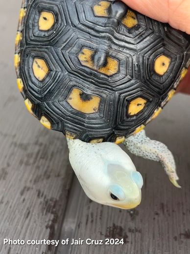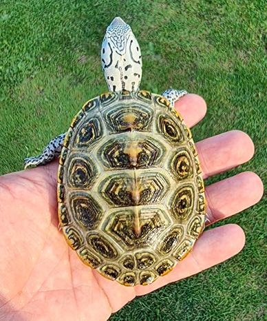 White Concentric Diamondbacks are arguably the most beautiful variation. The skin is pure white and marked with large black blobs or stripes. The carapace is generally golden with thick black rings on each costal and vertebral scute. Strangely the term "Concentric" in relation to Diamondback Terrapins actually refers to the skin markings, and not the concentric rings on the carapace. This does seem counterintuitive and it's use has probably evolved over time as more people keep and breed these turtles in captivity.