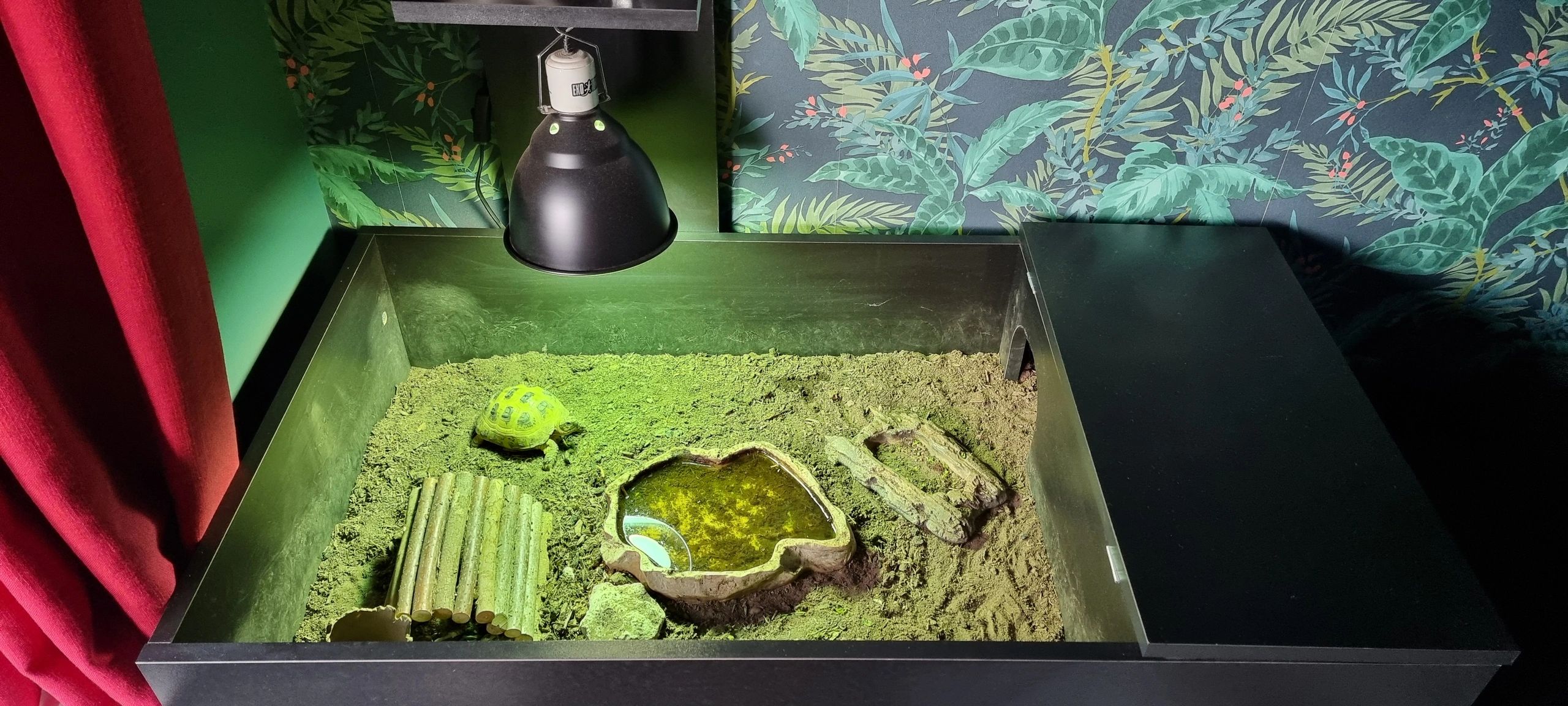 If you have a larger species, as it grows you will want to provide a larger area. Hobbyists recommend taking a flatpack bookcase, removing the shelves and lying flat as an ideal homemade tortoise table. This provides a large area to roam. I would advise lining with plastic before you fill with substrate, to protect the thin base. I don't recommend a large habitat like this for baby tortoises, as it allows them to wander too far from the heat source.